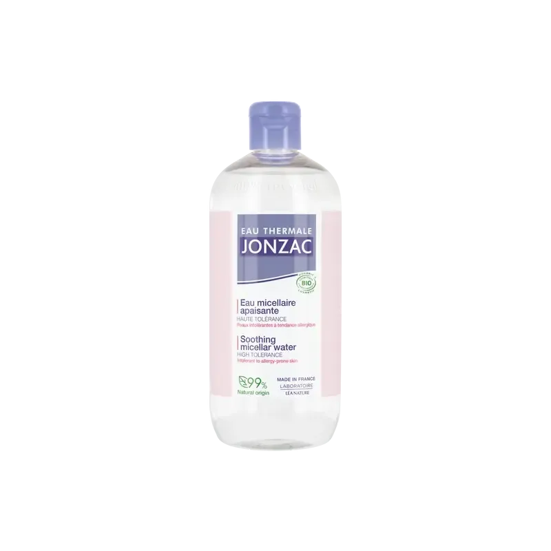 L'Eau Micellaire Apaisante Jonzac Reactive 500ml est un soin nettoyant et démaquillant spécialement formulé pour les peaux intolérantes, hyper-réactives, sensibles ou sujettes aux allergies. Développée sous contrôle dermatologique par la marque dermo-cosmétique bio Jonzac, cette eau micellaire offre une solution ultra-douce pour purifier et démaquiller le visage et les yeux, sans provoquer d'irritations ni de rougeurs. Sa formule minimaliste est enrichie à 99% en Eau Thermale de Jonzac, réputée pour ses propriétés apaisantes, hydratantes et régénérantes, ainsi qu'en glycérine végétale, pour un nettoyage efficace qui respecte l'équilibre fragile des peaux les plus délicates.