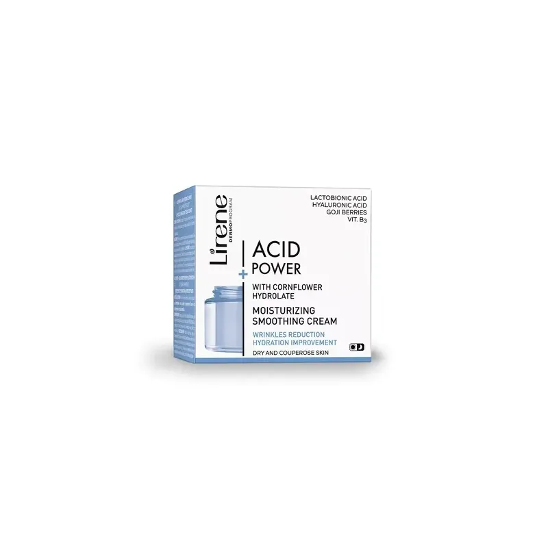 LIRENE ACID POWER MOISTURIZING SMOOTHING CREAM 50ML (Crème Hydratante et Lissante) est un soin quotidien conçu pour hydrater intensément et lisser la texture de la peau, tout en offrant une action apaisante. Faisant partie de la gamme Acid Power, cette crème utilise des ingrédients actifs puissants pour renouveler et rajeunir l'apparence de la peau. Elle contient des ingrédients hydratants de premier plan comme le Beurre de Karité, l'Acide Hyaluronique et la Glycérine, ainsi que des vitamines et des acides doux (Acide Lactobionique, Niacinamide) qui améliorent l'élasticité et l'éclat de la peau sans provoquer d'irritations agressives. Elle est formulée pour réduire les signes de l'âge, apaiser les rougeurs et laisser la peau visiblement plus fraîche, douce et dynamique.