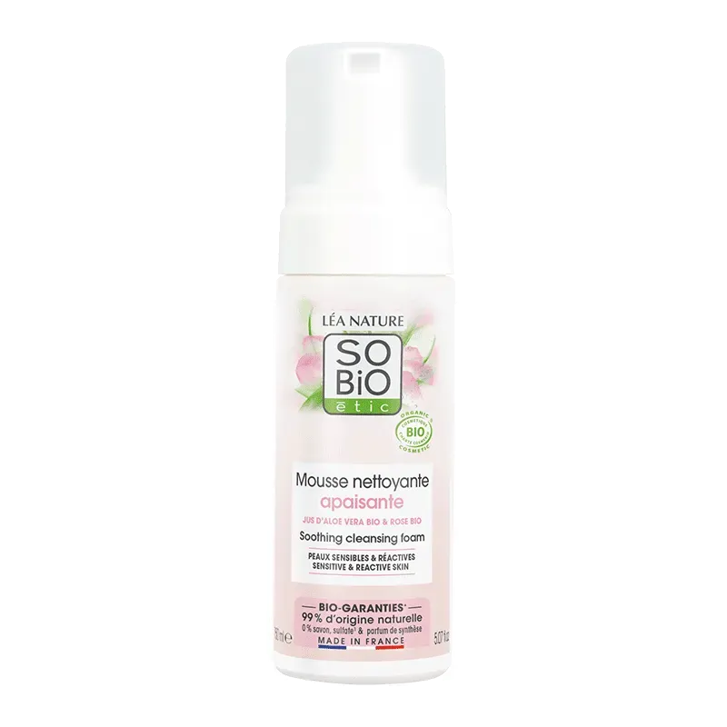 Mousse nettoyante apaisante sans savon ni sulfate à l'Aloe Vera Bio, nettoie en douceur et hydrate les peaux sensibles et réactives.
