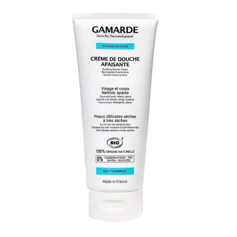 GAMARDE CRÈME DE DOUCHE APAISANTE 200ML est un soin lavant doux et onctueux conçu pour nettoyer la peau sans l'agresser. Elle combine l'efficacité d'un gel nettoyant avec la douceur et l'onctuosité d'une crème nourrissante. Idéale pour les peaux sèches et les peaux délicates, elle est formulée avec 72% de crème nourrissante, ce qui lui permet d'apaiser immédiatement les sensations d'inconfort, de tiraillements et de démangeaisons. Enrichie en actifs hydratants et apaisants comme l'Aloe Vera Bio, l'Huile d'Argan Bio et le Beurre de Karité Bio, elle laisse la peau intensément nourrie, douce et un confort immédiat est retrouvé. Ce soin peut être utilisé pour le visage et le corps.