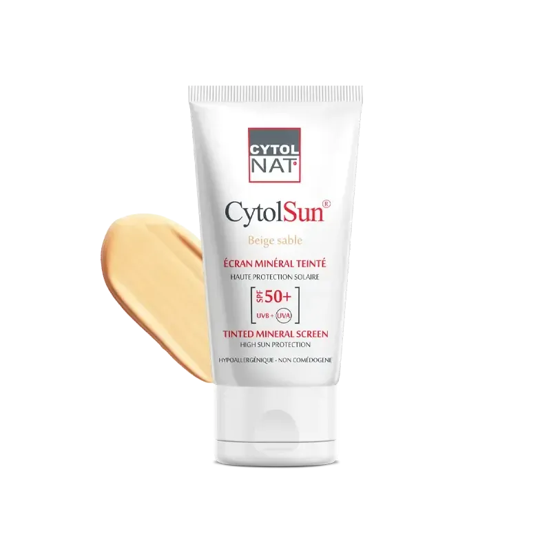 L'Écran Solaire CYTOLSUN Teinté SPF50+ de Cytolnat est un soin quotidien qui offre une très haute protection solaire tout en sublimant le teint. Dans la nuance Beige Sable, cette crème allie une défense maximale contre les rayons UVA et UVB à l'effet perfecteur d'un fond de teint léger. Sa formule enrichie en actifs hydratants et antioxydants protège la peau du photovieillissement, des taches solaires et des coups de soleil, tout en masquant les petites imperfections pour un teint unifié, lumineux et naturellement éclatant. Sa texture fondante et non grasse assure un confort optimal et un fini impeccable qui dure toute la journée.