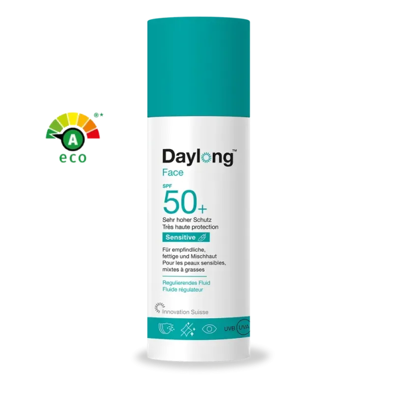 DAYLONG FACE SENSITIVE SPF50+ FLUIDE REGULATEUR 50ML est une très haute protection solaire quotidienne spécialement formulée pour les peaux sensibles, mixtes à grasses, et même à tendance allergique au soleil.Ce fluide léger et non gras offre une double action : une défense efficace contre les rayons UV et une régulation de la production de sébum pour un teint mat.