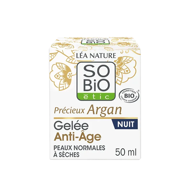 La Crème de Nuit Anti-Âge Précieux Argan de SO'BiO étic est un soin régénérant intensif conçu pour agir pendant le sommeil, moment clé de la réparation cellulaire. Spécialement formulée pour les peaux matures ou les peaux présentant des signes de l'âge (rides, perte de fermeté et d'éclat), cette crème riche et onctueuse apporte nutrition et confort. Concentrée en Huile d'Argan Biologique, reconnue pour ses vertus anti-âge et régénérantes, elle agit pour améliorer la fermeté et l'élasticité de la peau. Elle contient également de l'Acide Hyaluronique Végétal pour une hydratation en profondeur. Au réveil, la peau est visiblement plus souple, nourrie, et les traits sont lissés.