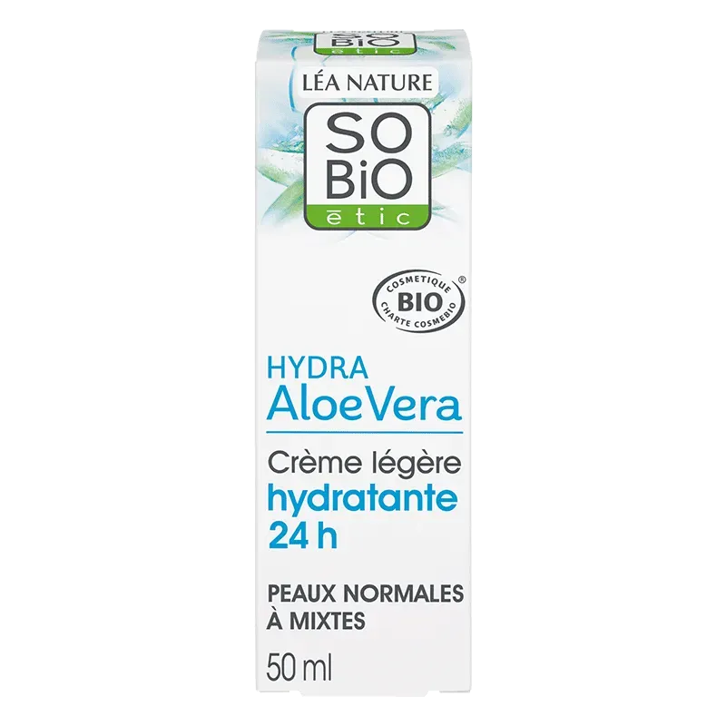 La SO BIO HYDRA ALOE VERA CREME LEGERE HYDRATANTE 24H est un soin visage quotidien de la gamme Hydra Aloe Vera de SO'BiO étic, spécialement conçue pour les peaux normales à mixtes à la recherche d'une hydratation efficace sans sensation de lourdeur. Cette crème, certifiée biologique, garantit une hydratation intense et durable pendant 24 heures. Sa texture fraîche et non grasse pénètre instantanément l'épiderme, apportant un confort immédiat et laissant la peau douce et souple. Elle est formulée avec du Pur Jus d'Aloe Vera bio équitable aux propriétés hydratantes et apaisantes, associé à l'Acide Hyaluronique naturel qui agit comme un réservoir d'eau pour protéger la peau du dessèchement. Ce soin est idéal pour les peaux ayant à la fois des zones sèches et des zones plus grasses (zone T).