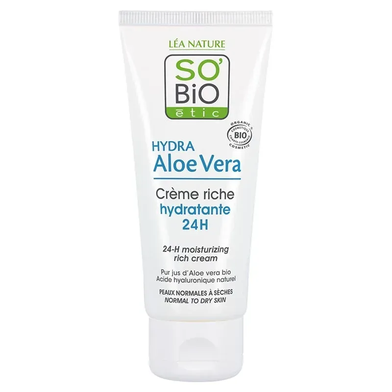 La Crème Nuit Intense Hydratante Aloe Vera de SO'BiO étic est un soin de nuit riche et réconfortant conçu pour les peaux déshydratées, normales à sèches, qui ont besoin d'une hydratation intense pendant la phase de régénération nocturne. Sa formule concentrée en Pur Jus d'Aloe Vera Biologique offre une action hydratante, apaisante et réparatrice optimale. Elle est également enrichie en Acide Hyaluronique, connu pour sa capacité à retenir l'eau au cœur de l'épiderme. Sa texture onctueuse enveloppe la peau d'un voile de douceur et de fraîcheur. Au réveil, la peau est intensément hydratée, apaisée, repulpée et visiblement plus fraîche.
