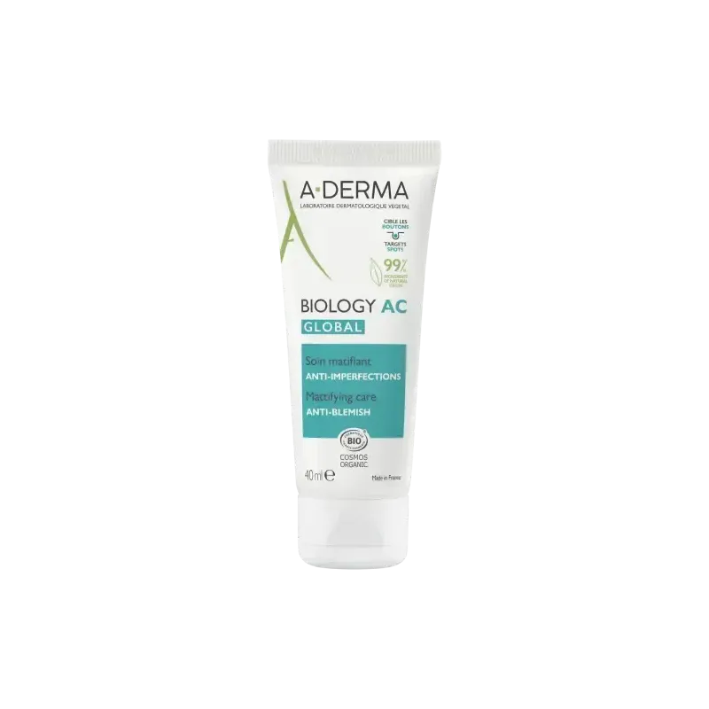 A-DERMA BIOLOGY AC GLOBAL SOIN MATIFIANT ANTI IMPERFECTIONS 40ML est un soin dermatologique complet, certifié BIO, conçu pour les peaux à tendance acnéique (boutons, points noirs, marques). Ce soin hydratant et matifiant cible de manière globale les imperfections, y compris les marques rouges et brunes post-acné, tout en rééquilibrant le microbiome pour aider à prévenir la récidive. Avec une formule innovante contenant 99% d'ingrédients d'origine naturelle, il désincruste les pores, réduit l'excès de sébum et offre un fini mat, non collant et non gras. Il est adapté aux pré-adolescents (dès 9 ans), aux adolescents et aux adultes, et constitue une excellente base de maquillage.