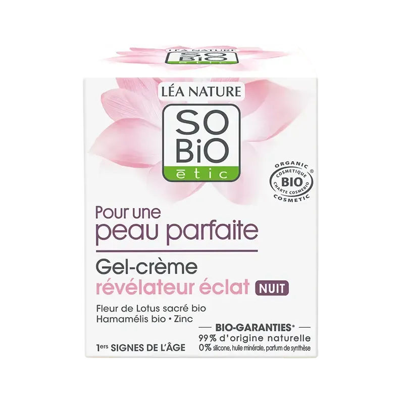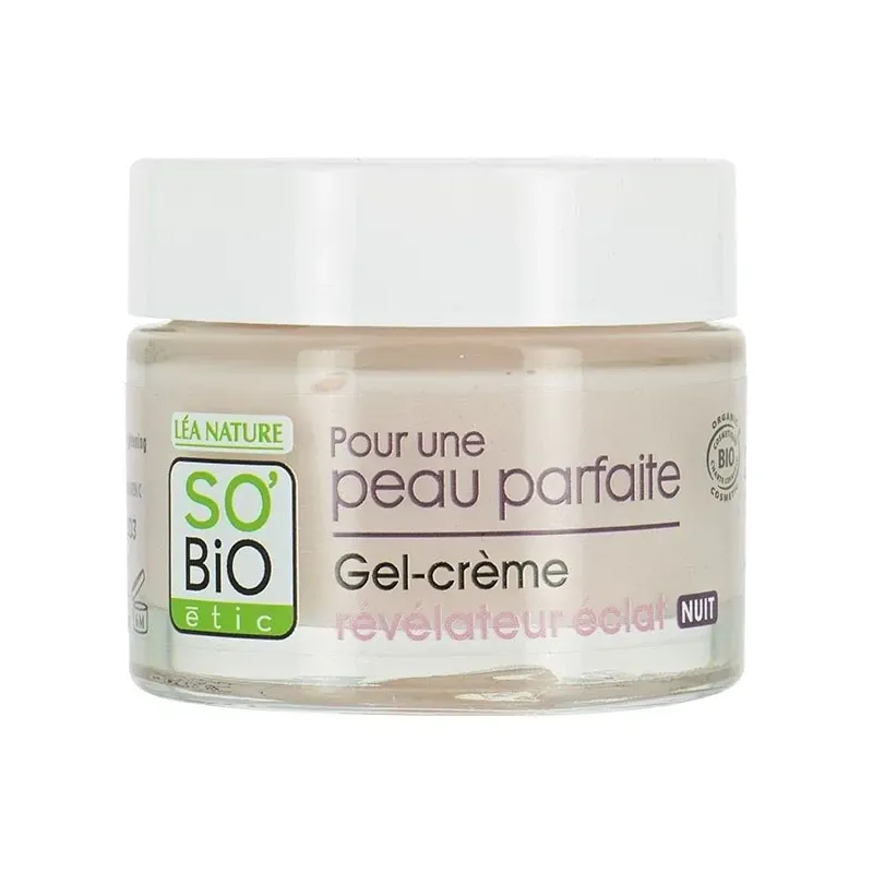Le Gel-Crème Révélateur Éclat Nuit de SO'BiO étic est un soin de nuit appartenant à la gamme "Pour Une Peau Parfaite", spécifiquement conçu pour agir durant le sommeil, moment clé de la régénération cutanée. Sa texture hybride gel-crème, fraîche et légère, pénètre rapidement, offrant un effet adoucissant sans surcharger la peau. Ce soin cible les premiers signes de l'âge et la perte d'éclat due à la fatigue et au stress. Sa formule concentrée en actifs, dont un complexe breveté, hydrate, apaise et repulpe la peau. Nuit après nuit, il contribue à lisser les traits et à unifier le teint. Au réveil, la peau est visiblement rebondie, confortable et le teint est plus lumineux et reposé.