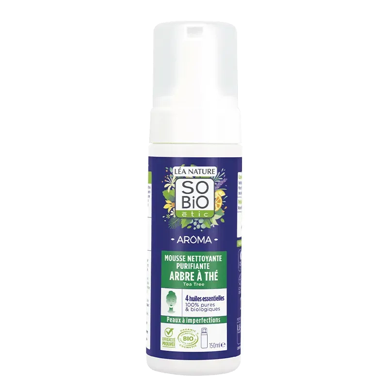 La SO BiO MOUSSE NETTOYANTE PURIFIANTE TEA TREE (ARBRE À THÉ) est un soin nettoyant certifié biologique de la gamme Aroma, spécifiquement conçu pour le nettoyage quotidien des peaux à imperfections (peaux grasses, à problèmes, adolescents). Cette mousse aérienne et onctueuse allie la douceur de ses agents lavants à l'efficacité purifiante d'un complexe d'Huiles Essentielles Biologiques. Elle nettoie la peau en profondeur sans l'agresser, élimine l'excès de sébum et les impuretés, et aide à assainir l'épiderme. Jour après jour, la peau est visiblement plus nette, purifiée, fraîche et retrouve un grain de peau plus sain.