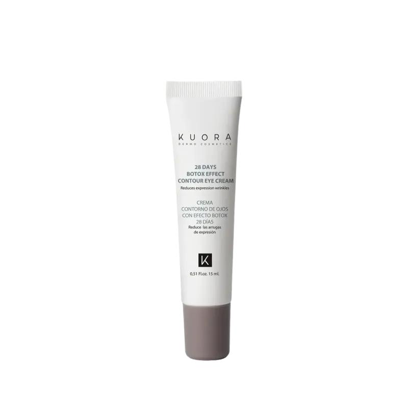 Le KUORA CONTOUR DES YEUX BOTOX est un soin ciblé conditionné en petit format de quinze millilitres, spécifiquement développé pour la zone fragile du contour des yeux et des lèvres. Il tire son nom d'un peptide synthétique, le SYN®-AKE (quatre pour cent), qui mime l'effet lissant du venin de vipère pour décrisper les micro-contractions musculaires responsables des rides d'expression comme les pattes d'oie. Ce soin a une action multi-bénéfices : il lisse les rides, atténue visiblement les poches et les cernes grâce à des actifs décongestionnants comme la Caféine et l'Extrait d'Hamamélis, et redonne souplesse et élasticité à la peau fine de cette zone. Des effets visibles sont promis après un traitement de vingt-huit jours, avec une réduction notable des contractions cellulaires et des pattes d'oie. Sa formule est conçue pour une haute tolérance : elle est sans paraben, sans alcool, sans silicone, et possède un parfum hypoallergénique.
