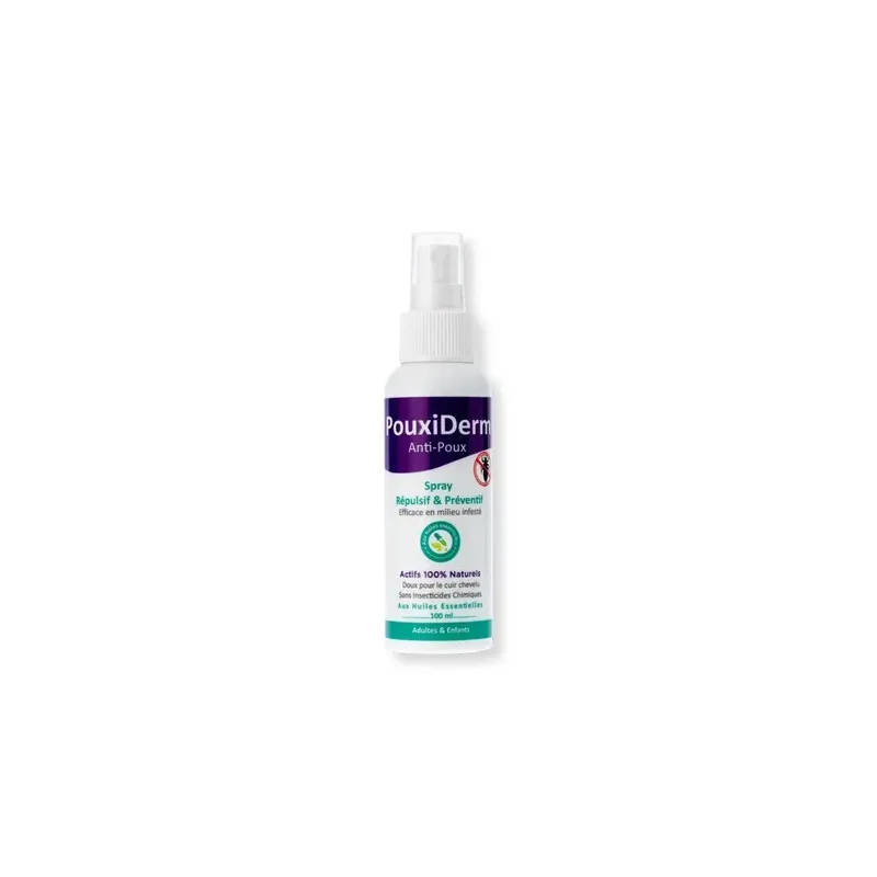 INODERMA POUXIDERM SPRAY RÉPULSIF & PRÉVENTIF ANTI-POUX est une solution sous forme de spray, conditionnée en flacon de cent millilitres, spécifiquement conçue pour la prévention des infestations et ré-infestations de poux. Sa formule se distingue par son utilisation d'actifs 100 % naturels et l'absence d'insecticides chimiques et d'alcool, ce qui la rend douce pour le cuir chevelu. Le spray agit en créant une barrière protectrice dont l'odeur (principalement due aux huiles essentielles) est désagréable pour les poux, les empêchant ainsi de s'installer sur la chevelure. Ce produit est idéal pour une utilisation quotidienne ou pendant les périodes à risque, notamment lors des épidémies en milieu scolaire ou dans les collectivités.