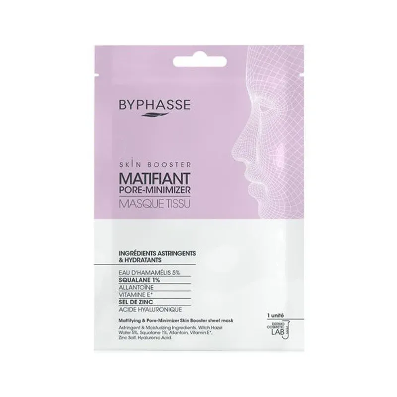 Le MASQUE TISSU SKIN BOOSTER MATIFIANT PORE-MINIMIZER BYPHASSE 18ML est un soin du visage à usage unique de la collection Skin Booster, spécialement formulé pour les peaux mixtes à grasses et à tendance acnéique. Ce masque en tissu 100% viscose est imprégné d'un sérum contenant des ingrédients astringents et séborégulateurs qui aident à diminuer la brillance de la peau et à réguler la taille des pores. Développé dans un laboratoire dermo-cosmétique, sa formule purifie la peau et la maintient propre et sous contrôle. En plus de son action matifiante et réductrice de pores, il assure également une bonne hydratation grâce à des actifs comme l'Acide Hyaluronique et le Squalane, pour un teint équilibré. Ce soin express est idéal le matin ou en fin de journée pour une peau purifiée et bien hydratée.