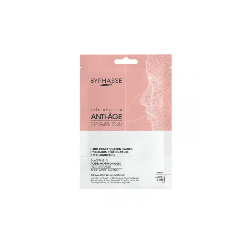 Le MASQUE TISSU SKIN BOOSTER ANTI-ÂGE BYPHASSE 18ML est un soin du visage à usage unique enrichi d'une haute concentration d'actifs pour lutter contre les signes du vieillissement cutané. Faisant partie de la collection Skin Booster, sa formule a été développée dans un laboratoire dermo-cosmétique avec une forte teneur en ingrédients d'origine naturelle (jusqu'à 95%). Ce masque en tissu 100% viscose est imprégné d'un sérum riche en actifs hydratants, régénérateurs et restructurants. Il est spécifiquement conçu pour aider la peau à retrouver rapidement son élasticité et sa fermeté, combattant ainsi l'apparence des rides et autres signes de l'âge. L'application de ce masque agit comme une "touche de magie" pour un effet rajeunissement express, idéal lorsque la peau est fatiguée ou avant une occasion spéciale.