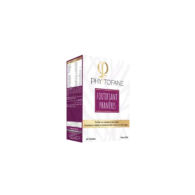 VITAL PHYTOFANE FORTIFIANT CHEVEUX ONGLES 60 GÉLULES est un complément alimentaire spécialement formulé pour fortifier et revitaliser les cheveux et les ongles cassants, fragiles ou dédoublés. Sa formule complète et synergique est un concentré de vitamines, de minéraux et d'actifs végétaux (comme la Levure de bière et la Kératine) qui agissent de l'intérieur pour renforcer la structure des phanères. Ce produit est un allié précieux pour retrouver une chevelure brillante et des ongles résistants.