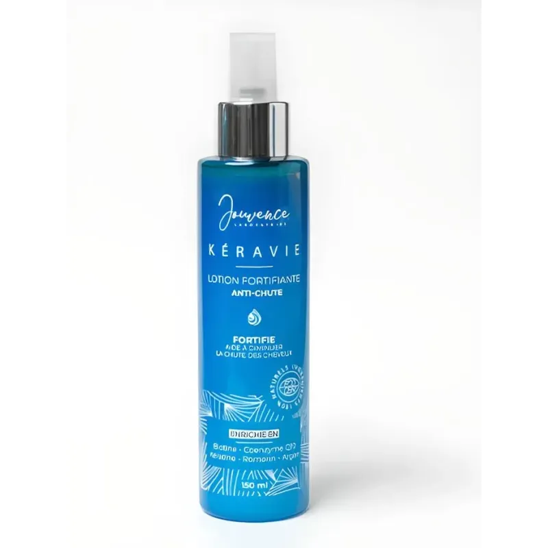 La Lotion Fortifiante Anti-Chute JOUVENCE KERAVIE est un traitement intensif sans rinçage, certifié ECOCERT, conçu pour agir directement sur le cuir chevelu afin de freiner la chute des cheveux et stimuler leur croissance. Sa formule hautement concentrée combine des ingrédients d'origine naturelle et des actifs reconnus pour leur efficacité capillaire : la Kératine qui renforce la fibre, la Biotine (Vitamine B7) qui nourrit le follicule, l'Ortie et le Romarin qui améliorent la microcirculation, et la Caféine qui dynamise les racines.