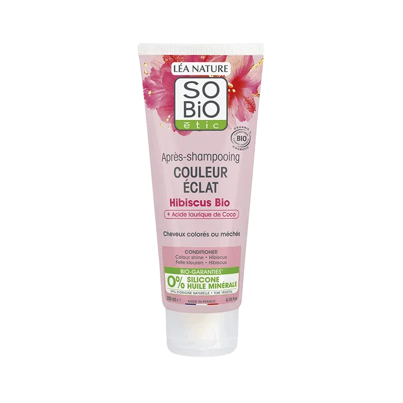 L'SO'BIO APRES-SHAMPOOING COULEUR ÉCLAT HIBISCUS est un soin capillaire certifié biologique formulé pour compléter l'action du shampooing de la même gamme. Il est spécifiquement destiné aux cheveux colorés ou méchés. Cet après-shampooing protège la couleur, aide à la préserver de l'affadissement grâce à l'action anti-oxydante de l'Hibiscus Bio, et nourrit intensément la fibre capillaire. Sa texture crémeuse facilite grandement le démêlage et combat la casse, laissant les cheveux instantanément plus souples, doux et brillants. Il peut être utilisé de deux façons : comme démêlant classique ou comme soin lavant (Co-Wash) pour espacer les shampooings.