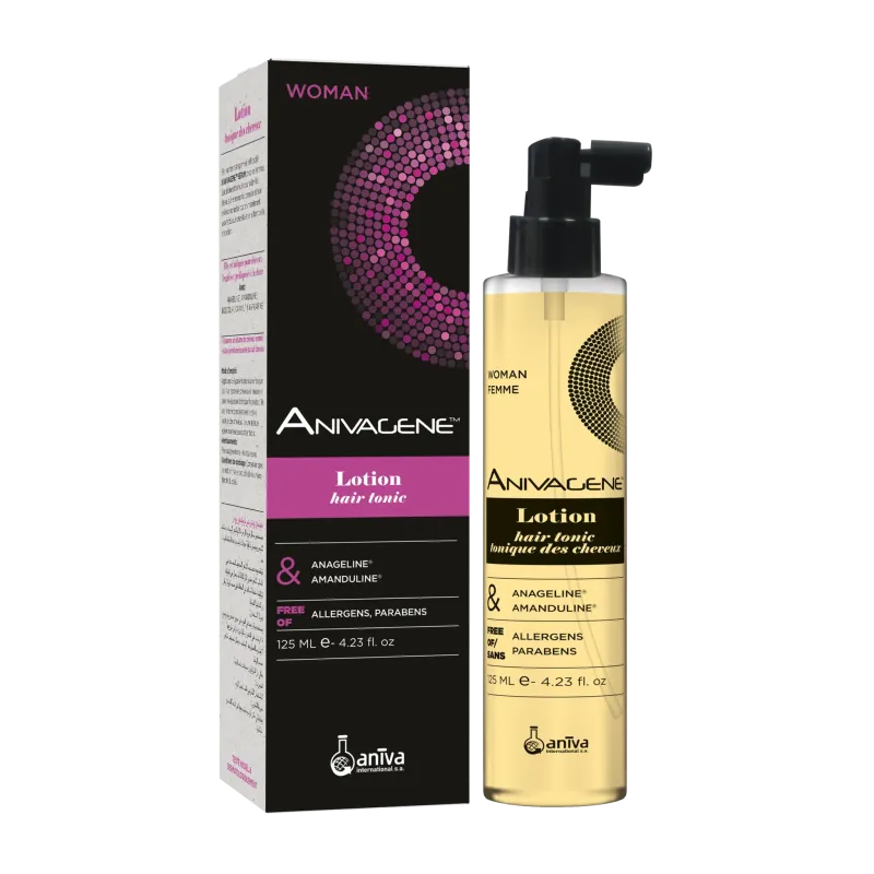Le ANIVAGENE LOTION CHEVEUX TONIQUE FEMME 125ML est un soin capillaire sans rinçage, spécialement conçu pour les femmes afin de réduire la chute de cheveux et maintenir la densité capillaire. Présentée sous forme de lotion légère en flacon pulvérisateur de $125 \text{ ml}$, sa formule est un cocktail d'actifs fortifiants et brevetés (tels que Capixyl™, Anagéline® Bio, Kapilarine®) ainsi que des extraits végétaux. Elle agit en stimulant la microcirculation du cuir chevelu, favorisant ainsi l'apport de nutriments essentiels aux follicules pileux. Ce tonique contribue également à protéger le cuir chevelu des agents pathogènes et à revitaliser la chevelure pour un volume et une santé retrouvés. Sa texture légère permet une application facile et ne nécessite pas de rinçage.