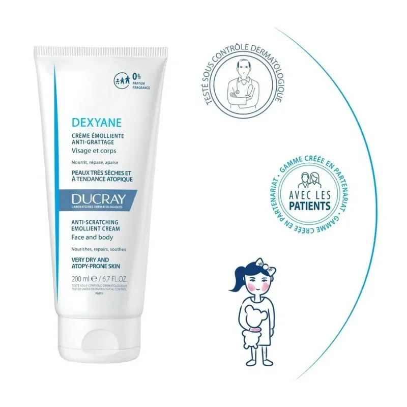 Baume émollient Ducray pour peaux très sèches et atopiques, il nourrit, répare la barrière cutanée, et soulage immédiatement les démangeaisons sur le visage et le corps de toute la famille.