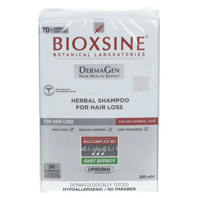 Le Shampoing Anti-Chute Cheveux Secs-Normaux BIOXCIN (ou BIOXSINE) en format 300ML est un soin capillaire formulé pour les hommes et les femmes qui souhaitent traiter la chute progressive des cheveux et renforcer leur chevelure. Ce shampooing végétal est spécifiquement adapté aux cheveux de nature normale à sèche. Sa formule repose principalement sur le Biocomplexe B11, un actif végétal breveté, dont l'action vise à stimuler la repousse, fortifier les follicules affaiblis et apporter le soin nécessaire à ce type de cheveu. Il est conçu pour être un complément idéal au traitement antichute, notamment en synergie avec le sérum concentré de la même marque.