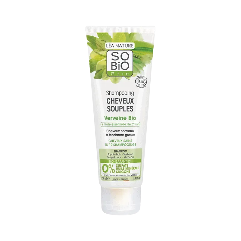 Shampooing sans sulfate à la verveine bio pour des cheveux souples, légers et d'une brillance naturelle.