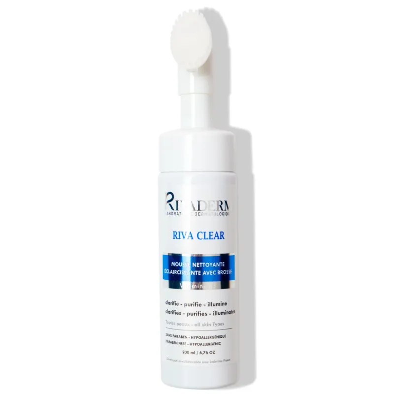 La RIVADERM RIVA CLEAR MOUSSE NETTOYANTE ÉCLAIRCISSANTE est un soin nettoyant visage formulé pour purifier, démaquiller et révéler l'éclat du teint. Présentée sous forme de mousse onctueuse, elle est souvent accompagnée d'une brosse intégrée pour un nettoyage en profondeur par mouvements circulaires. Elle agit avec une triple action : éclaircissante grâce aux AHA, régénérante et anti-âge grâce à la Vitamine B3 (Niacinamide), et hydratante et apaisante grâce aux extraits naturels. Elle aide à éliminer les impuretés et à minimiser l'aspect terne de la peau.