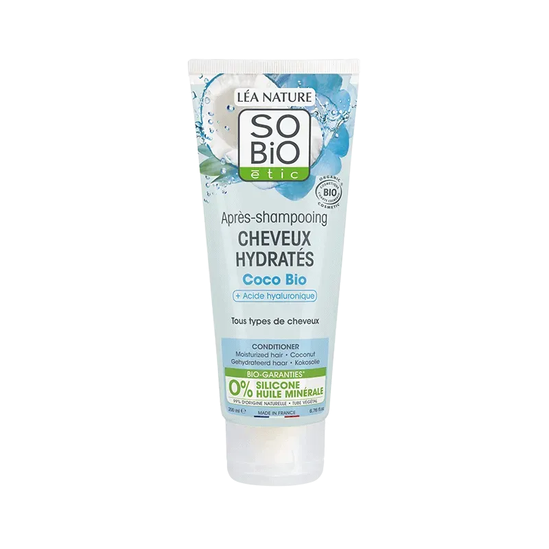 L'Après-Shampooing Cheveux Hydratés Coco & Acide Hyaluronique Bio de SO'BiO étic est un soin démêlant et hydratant intense conçu pour compléter la routine des cheveux secs, déshydratés ou ternes. Ce soin combine la richesse nourrissante de l'Huile de Coco Biologique et le pouvoir hydratant de l'Acide Hyaluronique Végétal, une combinaison qui permet d'infuser de l'eau au cœur de la fibre capillaire tout en scellant l'hydratation et en facilitant le démêlage. Sans silicone, sa texture fondante gaine le cheveu, apporte de la souplesse et de la brillance sans alourdir. Après utilisation, les cheveux sont doux, parfaitement hydratés, faciles à coiffer et délicatement parfumés à la noix de coco.