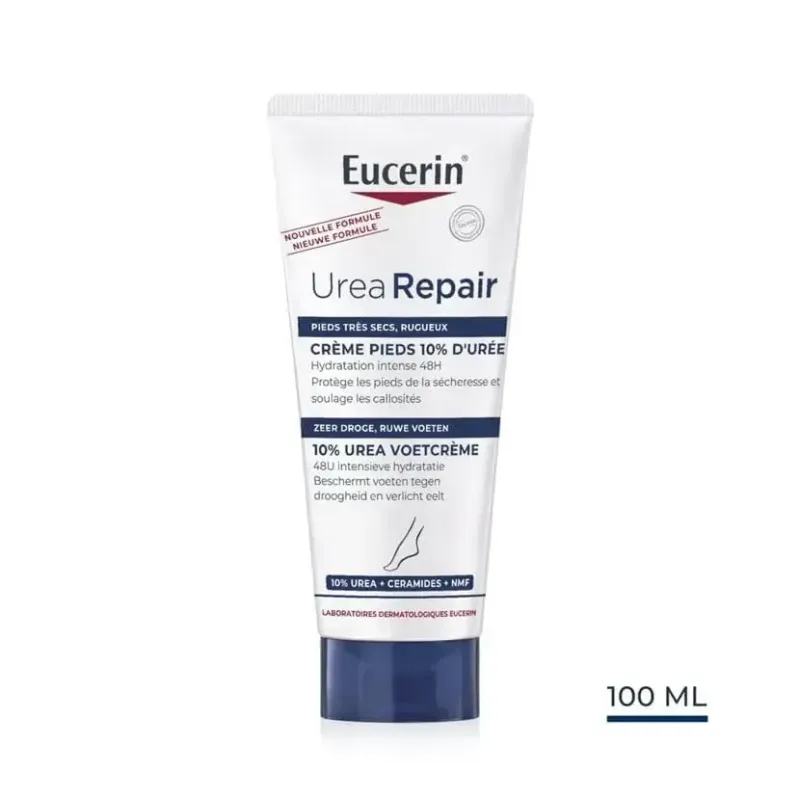 La crème pour les pieds EUCERIN UREA REPAIR PLUS est un soin intensif conçu pour les pieds très secs et rugueux, sujets aux callosités et aux épaississements. Sa formule, ultra-concentrée en 10% d'Urée, agit en profondeur pour lisser et adoucir la peau, tout en éliminant les cellules mortes. L'Urée est un puissant actif kératolytique et hydratant qui aide à briser les liens entre les cellules mortes, rendant la peau plus souple. La crème contient également du Déxpanthenol et de l'Aquaporine, un complexe qui hydrate intensément et durablement la peau pendant 48 heures. Sa texture riche et non grasse pénètre rapidement, offrant un confort immédiat et laissant la peau douce et apaisée. Son utilisation régulière aide à prévenir la réapparition de la sécheresse, des callosités et des rugosités.