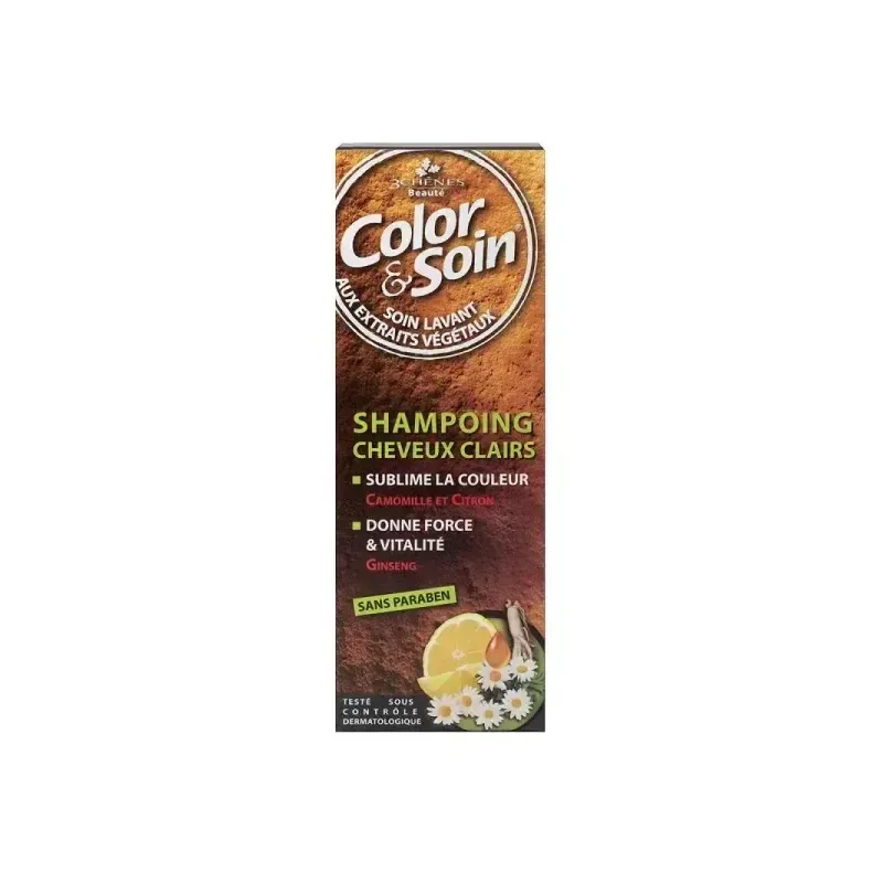 Le shampooing COLOR & SOIN Cheveux Colorés Clairs est un soin capillaire spécialement formulé pour les cheveux blonds, méchés ou décolorés. Il aide à prolonger l'éclat de la couleur, à protéger la fibre capillaire et à neutraliser les reflets jaunes indésirables. Sa formule, enrichie en Huile d'Argan Bio et en extrait de tournesol, nourrit et protège le cheveu des agressions extérieures. L'Huile d'Argan hydrate et fortifie la fibre capillaire, la laissant douce et brillante, tandis que l'extrait de tournesol agit comme un filtre UV naturel qui prévient la décoloration due au soleil. Le shampooing contient également des pigments violets qui neutralisent les reflets jaunes ou orangés, pour un blond plus pur et lumineux. Sa base lavante, douce et sans sulfate, nettoie délicatement le cuir chevelu sans l'agresser.