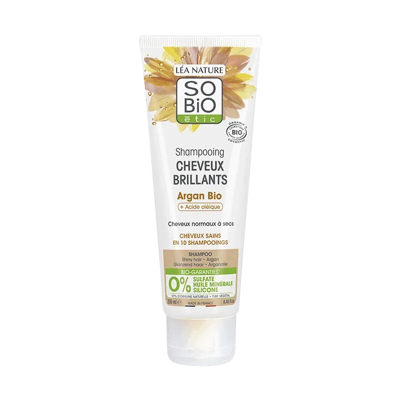 Le SO BIO SHAMPOOING CHEVEUX BRILLANTS ARGAN est un soin capillaire certifié biologique de la gamme Précieux Argan, conçu spécifiquement pour nourrir et illuminer les cheveux normaux à secs, même les plus ternes. Formulé sans sulfates (sans tensioactifs sulfatés), sans silicone et sans paraben, il offre un nettoyage doux qui respecte la fibre capillaire et le cuir chevelu. Enrichi en Huile d'Argan bio et en Acide Oléique (issu notamment de l'Huile d'Olive bio), ce shampooing apporte une nutrition essentielle qui permet aux cheveux de retrouver leur élasticité, leur souplesse et un effet soie. Il promet des cheveux visiblement plus sains et éclatants de lumière en seulement 10 shampooings.