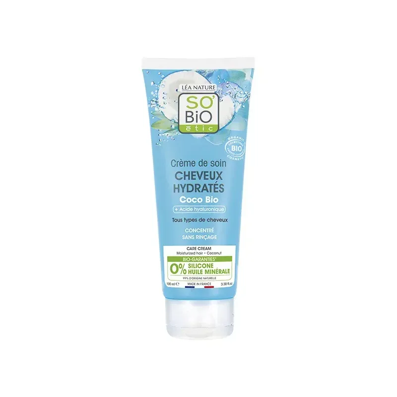 La Crème de Soin Cheveux Hydratés Coco Bio de SO'BiO étic est un soin capillaire multi-usage, sans rinçage, spécialement conçu pour hydrater intensément et nourrir les cheveux secs, très secs ou déshydratés. Enrichie en huile de Coco Biologique, reconnue pour ses propriétés émollientes et protectrices, et en Kératine Végétale qui renforce la fibre, cette crème légère pénètre rapidement sans alourdir. Elle aide à discipliner les frisottis, facilite le coiffage, prévient les fourches et apporte une brillance naturelle et un toucher soyeux. Son parfum exotique de coco procure un véritable moment d'évasion. Elle s'utilise aussi bien sur cheveux secs que mouillés et ne nécessite pas de rinçage, ce qui en fait un allié parfait pour la routine quotidienne.