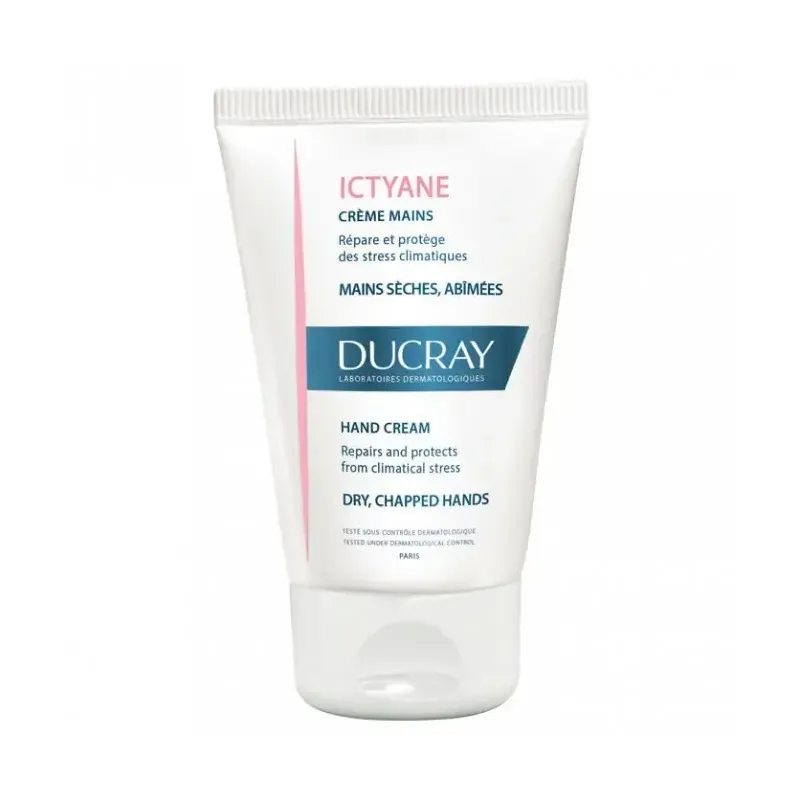 La Crème Mains ICTYANE des Laboratoires Ducray est un soin hydratant et protecteur spécialement conçu pour les mains sèches et abîmées par les agressions climatiques (froid, vent) et les stress quotidiens (lavages fréquents, produits ménagers). Sa formule experte à base d'un complexe vitaminique réparateur et du beurre de karité contribue à restaurer l'épiderme fragilisé. Elle contient également le complexe thermo-protecteur TGS qui crée un film protecteur invisible contre les agressions extérieures, assurant ainsi une hydratation et une protection durables. Sa texture innovante est légère, permet une pénétration rapide et laisse un fini invisible et non gras, offrant un confort immédiat sans sensation collante.
