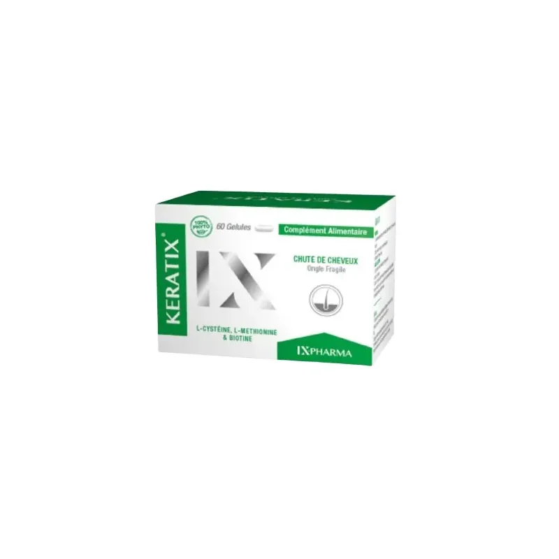 KERATIX ANTI CHUTE 60 COMPRIMES (souvent conditionnés en gélules ou capsules) est un complément alimentaire complet conçu pour lutter contre la chute des cheveux et renforcer les phanères (cheveux et ongles) fragilisés. Sa formule riche en acides aminés soufrés essentiels (L-Cystéine, L-Méthionine), vitamines du groupe B (Biotine, B5, B6, B1, B12, Acide Folique) et minéraux (Zinc) apporte les nutriments fondamentaux pour la synthèse de la kératine. En agissant de l'intérieur, il aide à stimuler la croissance, fortifier la fibre capillaire, revitaliser le cuir chevelu et améliorer la résistance des ongles cassants.