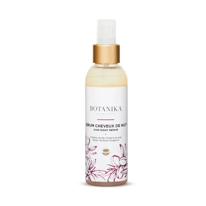 Sérum capillaire de nuit (150ml) BOTANIKA, formulé à base d'extrait de feuilles d'arganier et de protéines de blé et de soja. Il nourrit, régénère et renforce la fibre capillaire durant le sommeil, laissant les cheveux plus forts et brillants sans résidu au réveil.
