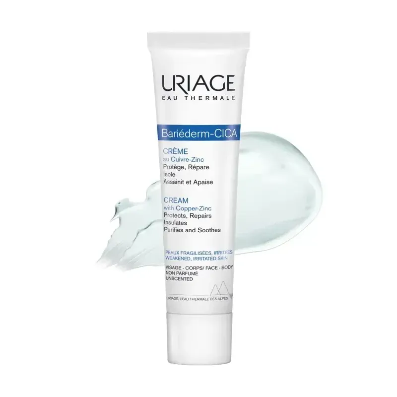 La Crème Cica Bariéderm au Cuivre-Zinc d'Uriage est un soin réparateur et assainissant destiné aux peaux fragilisées et irritées, qui peuvent être sujettes aux surinfections (irritations cutanées, petites lésions, post-actes dermatologiques mineurs). Sa formule est enrichie en Cuivre (Cu) et en Zinc (Zn), deux oligo-éléments aux propriétés antibactériennes et purifiantes, qui limitent la prolifération bactérienne. Le complexe breveté GF-Repair stimule les facteurs de croissance pour favoriser la réparation épidermique. L'Eau Thermale d'Uriage apaise immédiatement les irritations. Sa texture onctueuse et non grasse forme un pansement semi-occlusif à la surface de la peau, assurant une protection et une réparation rapides et efficaces.