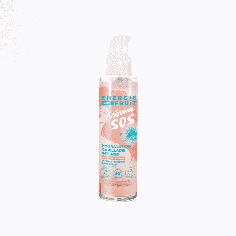 Le SÉRUM SOS HYDRA INTENSE d'Energie Fruit est un soin capillaire sans rinçage, ultra concentré, conçu pour réhydrater en profondeur les cheveux assoiffés (secs et déshydratés). Composé à 99% d'ingrédients d'origine naturelle et formulé sans silicone ni colorant, ce sérum est riche en Acide Hyaluronique et en extrait d'algue (microémulsion), agissant comme un agent anti-dessèchement puissant. Il restaure instantanément les longueurs et les pointes abîmées, nourrit la fibre en profondeur, et scelle l'hydratation pour une protection longue durée de 72H contre la casse et les fourches. La texture pénètre instantanément, laissant les cheveux lisses, souples, brillants et délicatement parfumés au Monoï.
