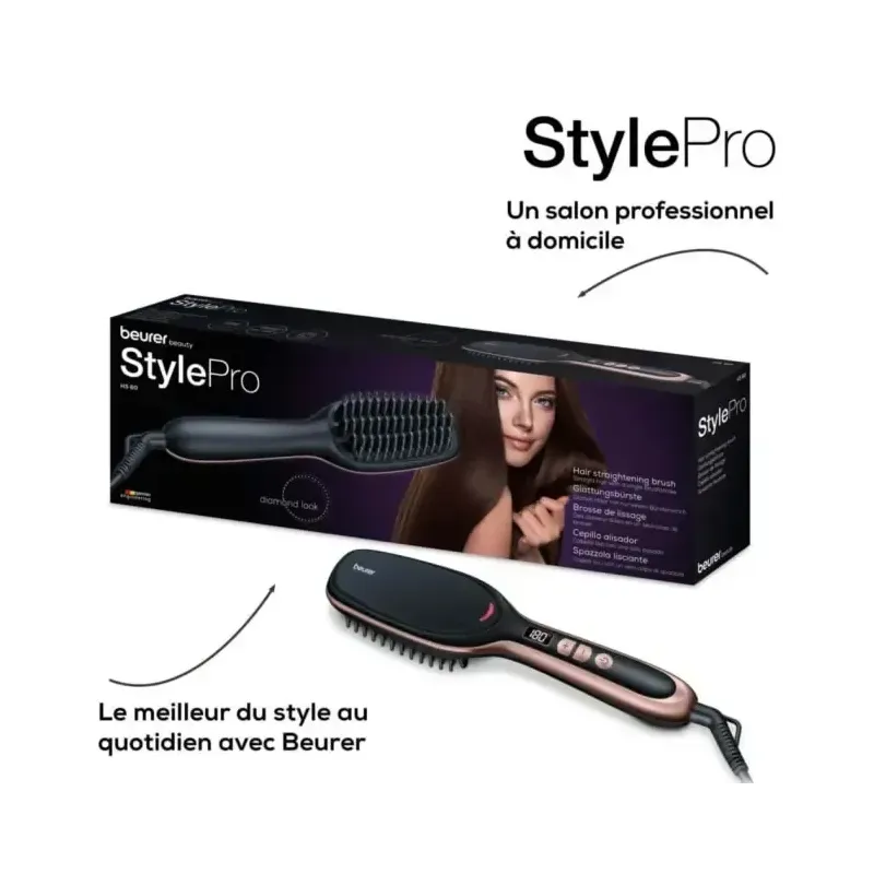 Brosse de lissage Beurer HS 60 avec revêtement céramique et fonction ionique anti-frisottis. Elle offre 5 réglages de température (120-200°C), chauffe rapidement et dispose d'un arrêt automatique pour la sécurité.