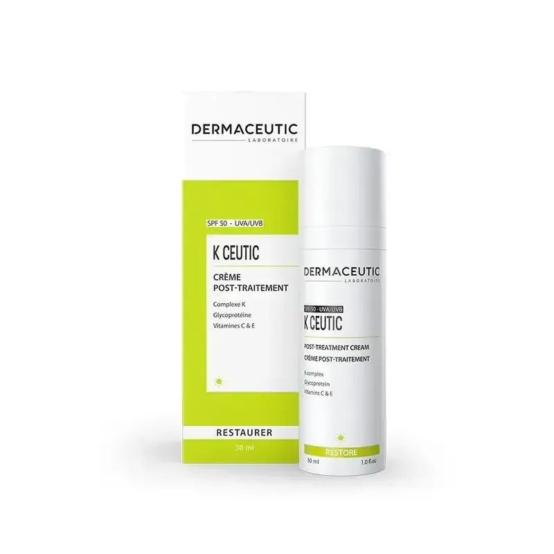 DERMACEUTIC K CEUTIC est un soin réparateur qui nourrit la peau et aide à réduire les rougeurs et irritations, grâce à sa concentration en vitamines K, C et E. Avec un SPF50, il offre une très haute protection contre les UVA et UVB, ce qui en fait un soin idéal après des procédures esthétiques.