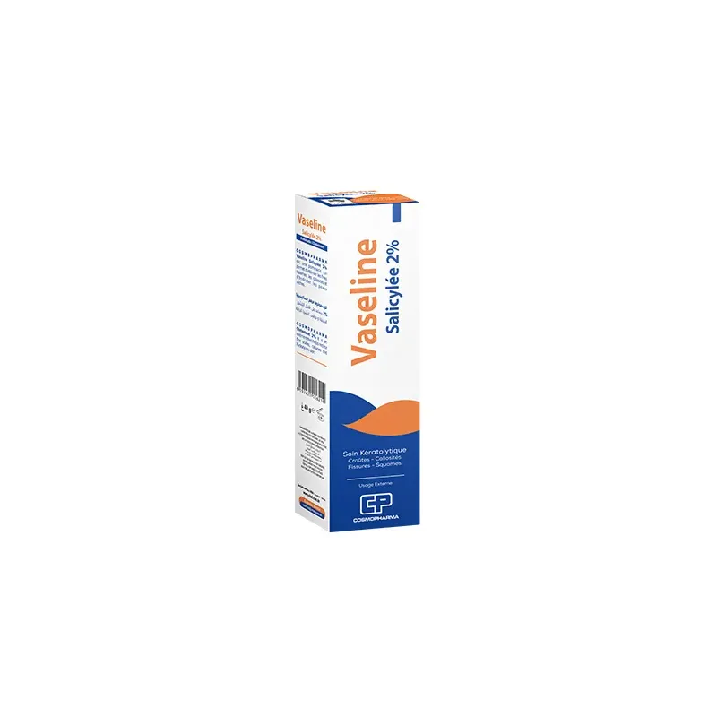 Pommade kératolytique (40g) à base de Vaseline et d'Acide Salicylique 2%, destinée à adoucir et éliminer les croûtes, callosités, fissures et squames sur les zones de peau rugueuses.