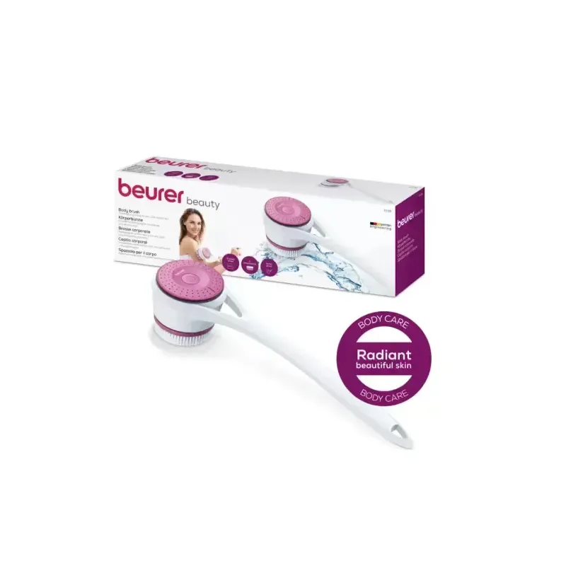 Brosse pour le corps Beurer FC 25 avec une tête rotative et deux niveaux de vitesse. Son long manche amovible et sa résistance à l'eau (IPX7) la rendent idéale pour un nettoyage et une exfoliation en profondeur du corps, y compris des zones difficiles d'accès.