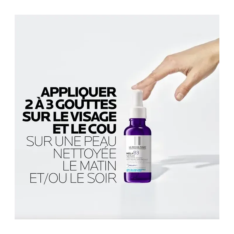 La Roche-Posay Sérum Mela B3 (30 ml) est un sérum concentré intensif, innovant, conçu pour corriger et prévenir les taches brunes (taches solaires, taches de vieillesse, mélasma, marques post-acnéiques) sur tous les types de peaux, même sensibles. Ce sérum se distingue par l'intégration d'un nouvel actif breveté, le Melasyl™, agissant en synergie avec la Niacinamide pour une efficacité anti-taches et anti-récidive remarquable.