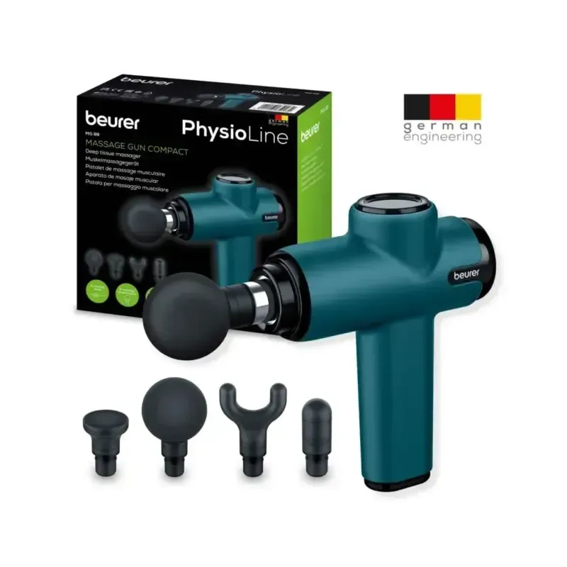 Pistolet de massage musculaire Beurer MG 99 Limited Edition pour un massage par percussion ciblé. Il dispose de 5 niveaux d'intensité, de 4 embouts interchangeables, d'une batterie longue durée et d'un écran tactile intuitif.