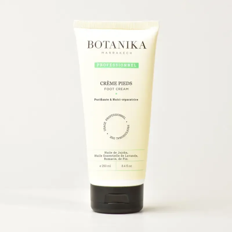 La CRÈME PIEDS de la gamme BOTANIKA MARRAKECH est un soin spécifique à la texture onctueuse conçu pour réconforter et réparer les pieds les plus secs et abîmés. Sa formule riche est une synergie d'ingrédients hautement nourrissants et d'actifs apaisants. Elle contient de l'Huile d'Argan, de l'Huile de Jojoba et de l'Extrait de Feuilles d'Arganier, qui agissent en profondeur pour relipider, hydrater et réparer la peau. De plus, un complexe d'huiles essentielles (Romarin, Lavande et Pin) procure une sensation d'apaisement et de revitalisation. Elle redonne élasticité et souplesse aux pieds, notamment au niveau des zones rugueuses comme les talons, et les laisse doux, rafraîchis et délicatement parfumés.