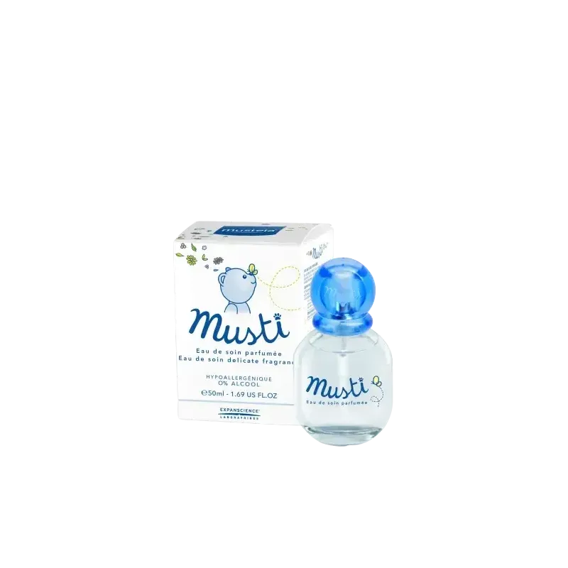 MUSTELA MUSTI EAU DE SOIN PARFUMÉE 50ML est une eau de toilette sans alcool, spécialement conçue pour parfumer délicatement la peau et les vêtements des bébés et enfants dès la naissance (hors prématurés).