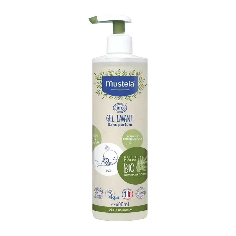 MUSTELA BIO GEL LAVANT CHEVEUX ET CORPS 400ML est un produit d'hygiène essentiel et certifié biologique, conçu pour le bain quotidien des bébés dès la naissance (y compris les bébés sortis de néonatologie) et de toute la famille.