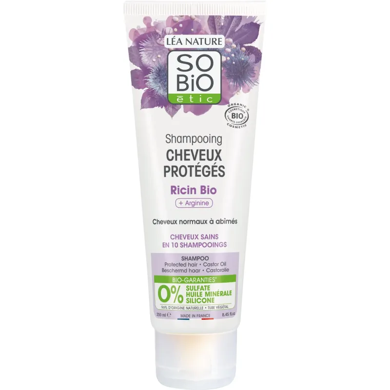 Le Shampooing Cheveux Protégés Ricin & Arginine Bio de SO'BiO étic est spécialement formulé pour les cheveux normaux à abîmés qui manquent de force et de vigueur. Sa composition, garantie sans sulfate, sans silicone et sans paraben, nettoie la chevelure en douceur tout en agissant sur la fibre capillaire pour la renforcer et la gainer. L'Huile de Ricin Bio, réputée pour ses vertus fortifiantes et régénératrices, agit en synergie avec l'Arginine pour aider les cheveux à retrouver force et résistance de la racine jusqu'aux pointes. Il permet aux cheveux de retrouver un éclat naturel et d'être mieux protégés contre les agressions extérieures.