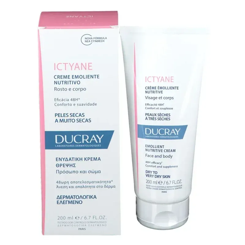 DUCRAY ICTYANE CRÈME ÉMOLLIENTE NUTRITIVE VISAGE ET CORPS 200ML est un soin hydratant et nourrissant quotidien spécifiquement formulé pour les peaux sèches à très sèches. Cette crème emblématique des Laboratoires Dermatologiques Ducray allie innovation et expertise pour offrir une hydratation intense et durable. Grâce à un duo d'actifs puissants (l'Acéfylline et l'Huile d'Abyssinie), elle restaure l'équilibre hydrique de la peau et renforce sa barrière protectrice. Sa texture veloutée, onctueuse et non collante, procure une sensation de confort immédiat, apaise les tiraillements et permet un habillage rapide. Elle laisse la peau douce, souple et délicatement parfumée, avec une efficacité d'hydratation prouvée pendant 48 heures.