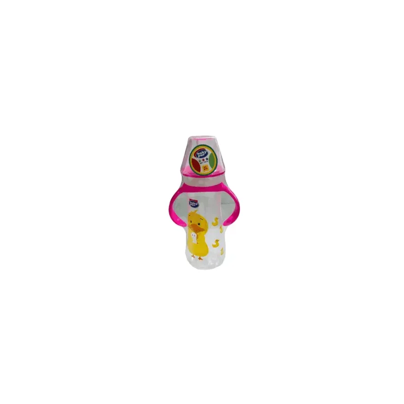 Biberon standard BABY PUR de 250 ml en PP Rose avec anses ergonomiques et couvercle torsadé sécurisé, conçu pour l'autonomie et les repas quotidiens de bébé.