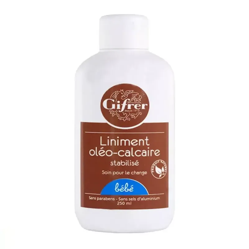 Le GIFRER LINIMENT OLÉO-CALCAIRE 250ML est un soin traditionnel naturel pour l'hygiène et la protection de la peau des bébés, particulièrement lors du change. Il s'agit d'une émulsion stable d'huile d'olive vierge extra de première pression à froid et d'une solution d'hydroxyde de calcium (eau de chaux), dont la formule est très proche des recettes ancestrales. Le liniment nettoie en douceur le siège sans nécessiter de rinçage. Il laisse sur la peau un film protecteur (film gras) qui isole l'épiderme de l'humidité et de l'acidité de l'urine et des selles, aidant ainsi à prévenir l'apparition de rougeurs et d'érythème fessier. Formulé avec près de $99\%$ d'ingrédients d'origine naturelle, il est testé sous contrôle dermatologique et pédiatrique pour une tolérance optimale.