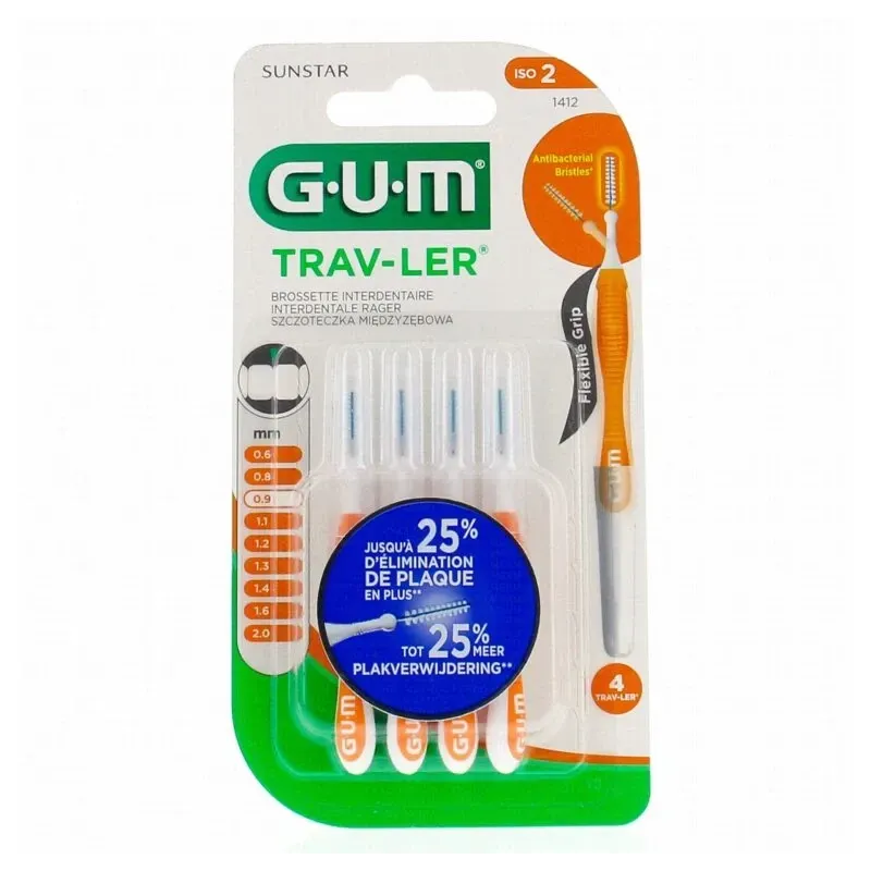Lot de 4 brossettes interdentaires GUM Trav-Ler Cylindrique 0,9 mm, idéales pour les espaces étroits, avec des brins antibactériens et un manche pliable pour une hygiène et une portabilité optimales.