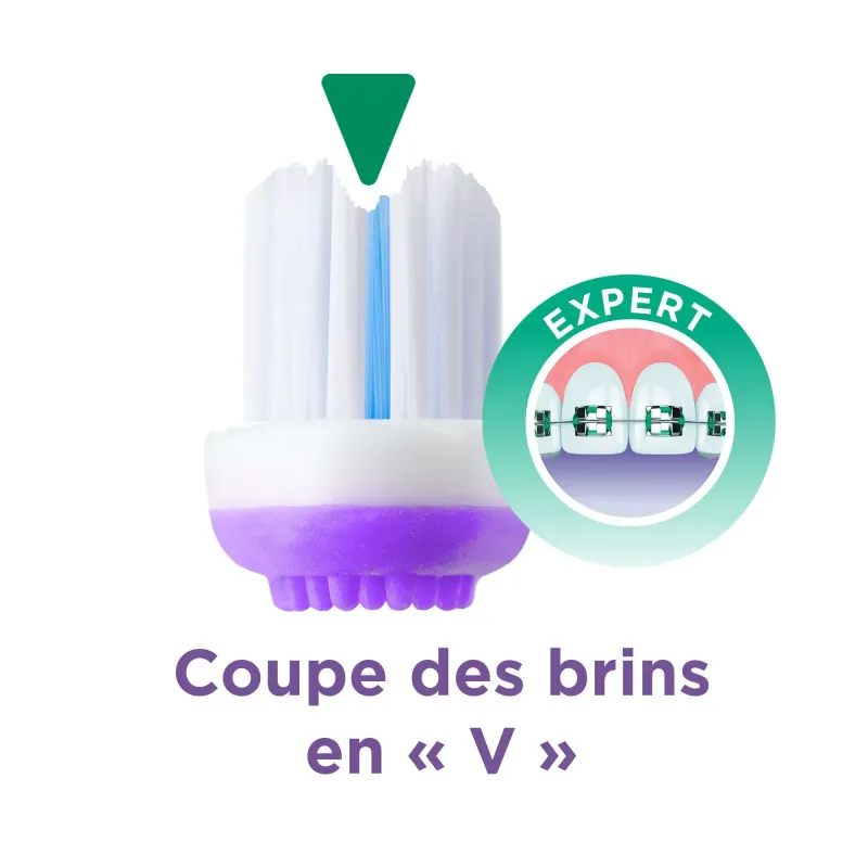 Brins en "V": La caractéristique la plus distinctive de cette brosse est la coupe de ses brins en forme de "V". Les brins centraux, plus courts, sont conçus pour nettoyer directement la surface du bracket et du fil, tandis que les brins extérieurs, plus longs, nettoient la surface de la dent au-dessus et au-dessous de l'appareil.