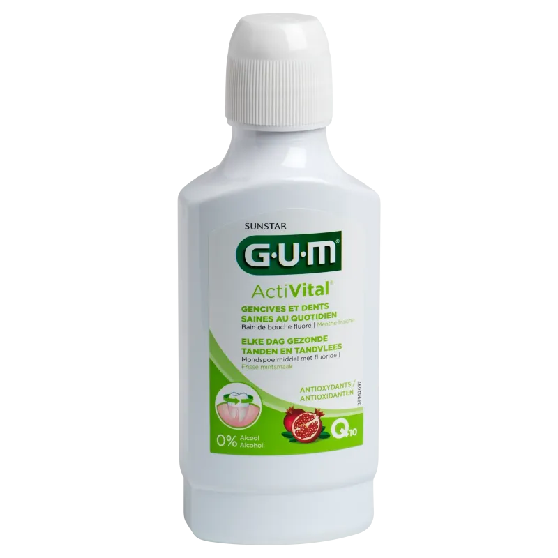 Bain de bouche GUM Activital, sans alcool, pour un usage quotidien. Aide à prévenir la plaque, renforce les dents et maintient des gencives saines.